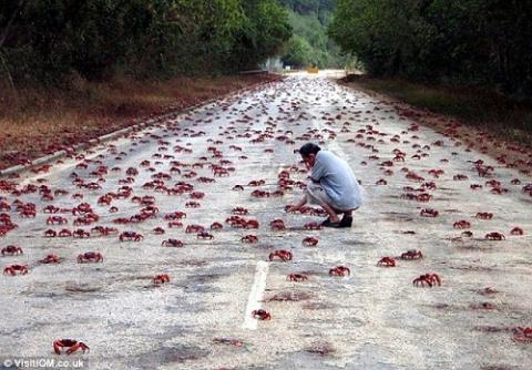 Trên đảo Christmas của Australia,hàng năm có hàng triệu con cua ot di cư tràn ngập trên đường đi lại, tạo nênmột cảnh tượng vô cùng tuyệt vời.
