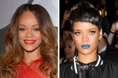 Không chỉ cắt tóc pixie táo bạo mà Rihanna còn thường xuyên xuất hiện với son môi màu xanh khác lạ. Kiểu tóc cá tính dường như hài hòa với cách trang điểm phá cách của cô ca sĩ.