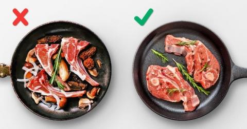 1. Chảo chật kín đồ ăn: Theo Buzz Feed, nếu bạn muốn miếng thịt có lớp vỏ giòn tan, hãy để chúng cách xa nhau khi rán và không nên đặt quá nhiều miếng trên chảo.