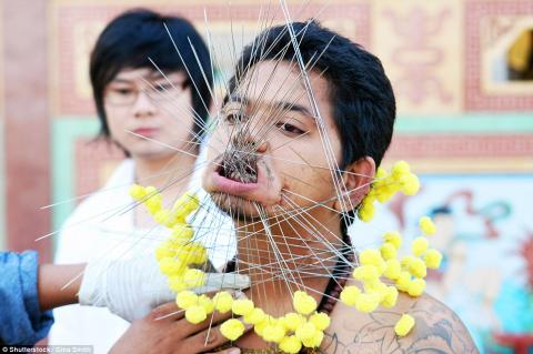 Trong suốt 9 ngày diễn ra lễ hội, người tham gia phải thể hiện lòng sùng kính qua việc “bấm khuyên” bằng những vật dụng khủng khiếp và đáng sợ. Bức ảnh được chụp năm 2012, một tín đồ đã xuyên hàng chục que xiên lên khuôn mặt của mình.