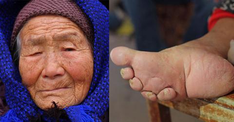 Quá trình này được bắt đầu trước khi khung xương chân của đứa trẻ có cơ hội phát triển. Việc bó chân thường được thực hiện vào mùa đông bởi chân trẻ sẽ bị tê lạnh, và vì thế bớt đi cảm giác đau đớn. Được hình thành từ thế kỷ thứ 10, nhưng đến năm 1911, tập tục này đã được xóa bỏ. Trong ảnh là một nhân chứng sống của tập tục bó chân được thịnh hành trong giới thượng lưu của Trung Quốc xưa, cụ năm nay đã 95 tuổi.
