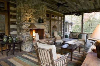 Kết cấu gỗ mộc, lò sưởi ấm cúng, bàn ghế do thợ địa phương làm rất hợp với hiên nhà bên sườn núi.