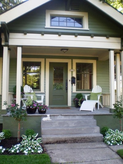 Ghế bập bênh bằng gỗ và ghế xích đu làm cho hiên nhà này thành một nơi nghỉ ngơi lý tưởng. Hãy tạo ra một hàng hiên bắt mắt bằng các màu sơn cùng tông.