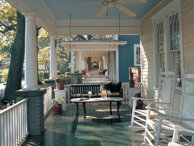 Quạt trần thường được sử dụng để trang trí và cũng để làm đúng chức năng của nó. Đây là một hàng hiên mở và thoáng mát nhưng vẫn có quạt khi cần lưu thông không khí.