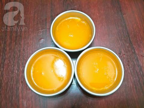 Cho nước cam vừa lọc được vào nồi, bật bếp đun sôi sau đó cho từ từ hỗn hợp đường và bột thạch đã trộn sẵn vào, vừa cho vừa khuấy đều, nấu vài phút cho thạch trong lại thì cho nước cốt cam, nước cốt chanh khuấy đều và đun sôi trở lại là tắt bếp. Sau đó đổ thạch vào khuôn. Đợi nguội thì đặt vào tủ lạnh cho đông lại.