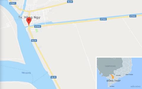 Cầu Hồng Ngự 2 (chấm đỏ), nơi cảnh sát bắt ma tuý. Ảnh: Google Maps.