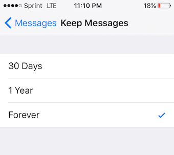 Đầu tiên, bạn vàoSettings > Messages > Keep Messages > chuyển từ Forever sang 30 ngày hoặc 1 năm.