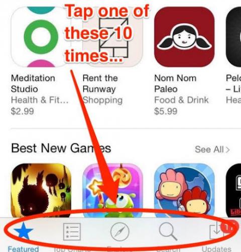 Thực hiện trên ứng dụng "App Store", đầu tiên bạn hãy mở tiện ích này lên. Chạm (tap) liên tiếp thật nhanh một trong những biểu tượng điều hướng bên dưới màn hình của ứng dụng. Giao diện màn hình sẽ chuyển sang màn hình trắng và tạm treo máy trong khoảng 1 giây, sau đó trở lại bình thường. Màn hình sẽ reset khoảng 1 giây sau đó trở lại bình thường.