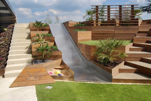 Một cách thiết kế khác đơn giản hơn là phân chia theo chiều cao sân sau theo