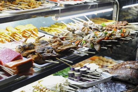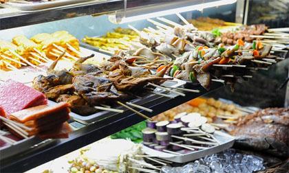 Bạn sẽ được nếm thử rất nhiều món xiên thú vị, ví như xiên nấm kim châm cuốncùng với bông cải và mướp tây sau khi ướp cùng với nước sốt cay chua ngọt đậm đà.