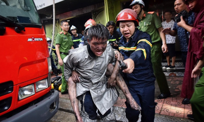 Trong vụ hỏa hoạn xảy ra ở cửa hàng quần áo trên phố Núi Trúc (Hà Nội) ngày 10/9, hình ảnh trung úy Vũ Ngọc Hoàng (26 tuổi, quê Đông Anh, Hà Nội) gương mặt đen sạm, người ướt sũng cõng em Nguyễn Hoàng Giang (18 tuổi) khỏi đám cháy khiến nhiều người xúc động. Khi được phát hiện ngất xỉu ở tầng 4 ngôi nhà đang cháy, nạn nhân Giang được đại úy Nguyễn Trung Hiếu - đội trưởng Đội Cảnh sát PCCC quận Ba Đình - và đồng đội nhường bình oxy, tiến hành sơ cứu, rồi nhanh chóng đưa ra ngoài. Ảnh: Phạm Thắng.