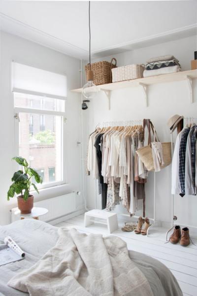 Treo những trang phục bạn mặc thường xuyên theo mùa ra bên ngoài. Các trang phục còn lại nên dược gấp gọn gàng và bỏ vào các giỏ. Làm như vậy, căn phòng sẽ trở nên gọn gàng và thoáng hơn.