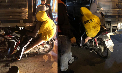 Cú tông mạnh khiến xe máy và đôi nam nữ găm chặt vào đuôi xe tải. Hậu quả, đôi nam nữ bị thương nặng phải đi cấp cứu.