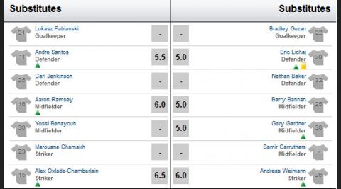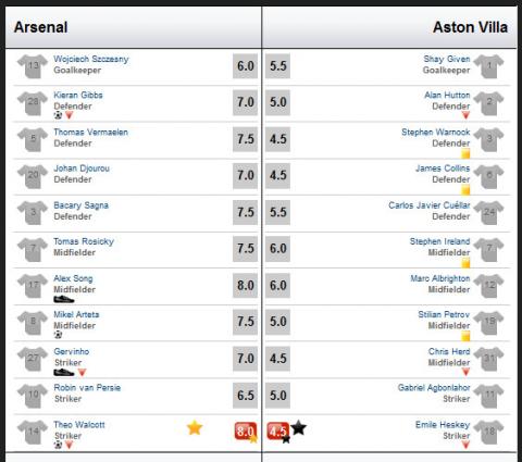 Arsenal: Szczesny, Sagna, Djourou, Vermaelen, Gibbs (Andre Santos 68'), Arteta, Song, Walcott (Chamberlain 76'), Rosicky, Gervinho (Ramsey 68'), Van Persie