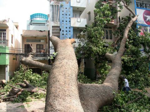 Cây cổ thụ trên đường Nguyễn Trãi, quận 5 – TP. HCM bật gốc chắn ngang đường.( Ảnh: Xuân Danh)