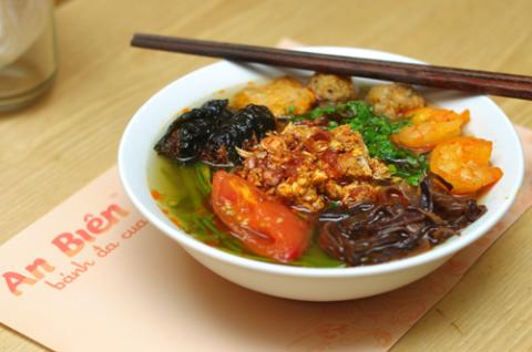 Đó là tiệm An Biên nằm trên phố Triệu Việt Vương. Quán mở được khoảng 2 năm, được biết đến là tiệm chính hiệu Hải Phòng. Ở đây, món bánh đa rất đúng phong cách đất Cảng, ngoài riêu cua, rau theo mùa còn có thêm chả lá lốt, tôm tươi, chả mọc, chả cá thu, mộc nhĩ khiến món ăn phong phú, bắt mắt hơn. Ngoài ra, nếu thật tinh ý, bạn sẽ thấy sợi bánh đa của quán mỏng, mềm, dai hơn. Theo lời đầu bếp "quảng cáo" thì đó là loại bánh đa tươi được đưa từ Hải Phòng về.