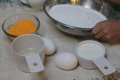 Chuẩn bị các nguyên liệu cho ra bát, đong sữa, dầu ăn, pho mai, bột năng.