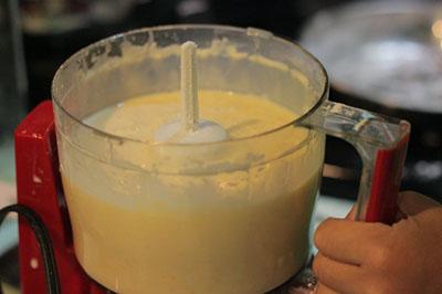 Cho tất cả các nguyên liệu vào máy sinh tố, bấm 15 giây đến khi trứng tan và hỗn hợp hòa quyện đều với nhau.