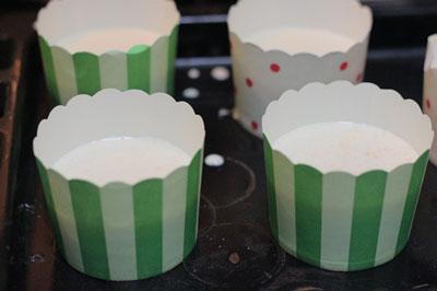 Cốc giấy dùng để nướng bánh xếp ra khay, múc hỗn hợp bột cho vào cốc, chỉ đổ đến 1/2 cốc giấy vì khi nướng bánh sẽ tiếp tục nở.