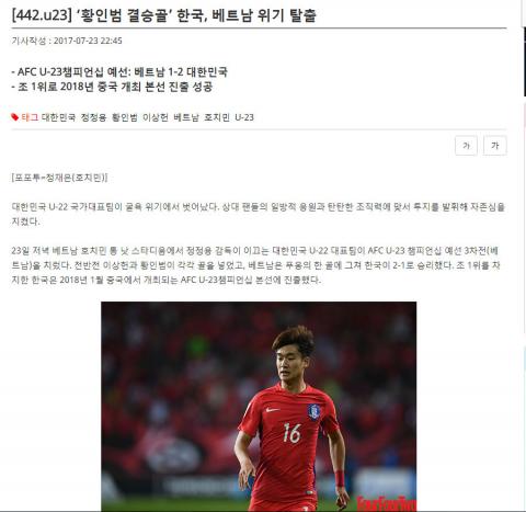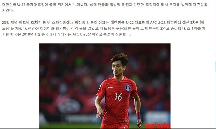 Sau 90 phút thi đấu, U22 Hàn Quốc giành chiến thắng vất vả 2-1 và trải qua nhiều giây phút lo lắng ở những phút cuối. Tờ FourFourTwo phiên bản Hàn Quốc cho rằng may mà đội nhà không bị phá lối chơi khi U22 Việt Nam có bàn gỡ hòa.