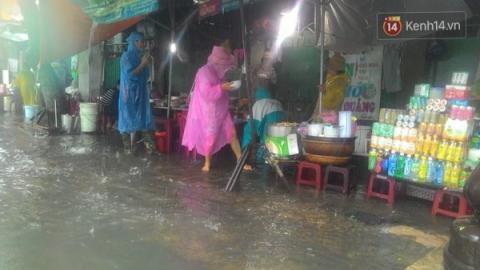 Nhiều cửa hàng gặp khó khăn khi nước mưa dâng cao tới tận cửa nhà.