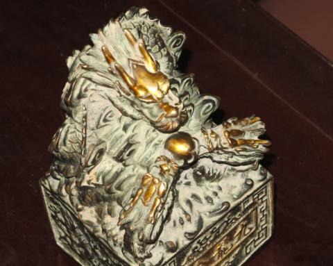 Trước đó, bà Nguyễn Thị Khương (SN 1969) và bà Vương Thị Đông (SN 1957) trú tại xã Nghi Lâm, huyện Nghi Lộc, Nghệ An cùng vào vườn đồi để hái rau má thì bất ngờ phát hiện ra một vật thể lạ. Vật thể lạ này được làm bằng kim loại, nặng khoảng 1,6 kg màu đen, vàng. Bao quanh có 9 đầu rồng, nặng khoảng 1,6 kg, mặt trước và mặt dưới có dòng chữ Hán.