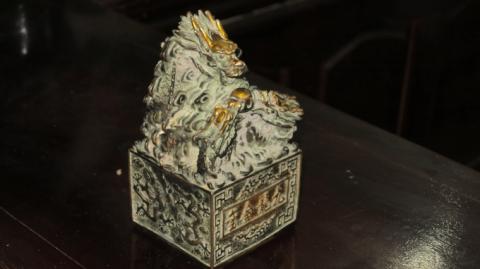 | Vật thể được cho là ấn tín của vua chúa làm bằng kim loại, nặng khoảng 1,6 kg. |