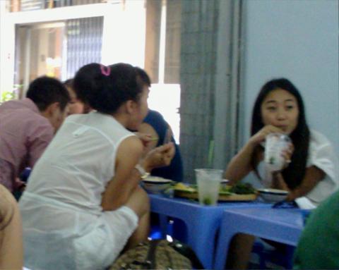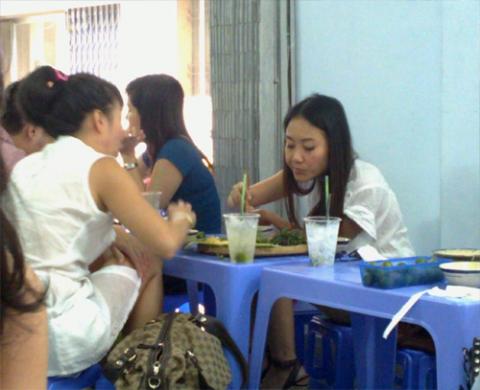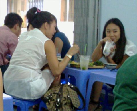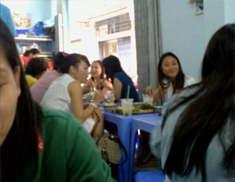 Nữ ca sĩ không đi cùng ông xã ngoại quốc mà ngồi ăn cùng một người bạn . Cả hai ăn rất vui vẻ tại quán bún đậu Cô khàn của người mẫu Trang Trần