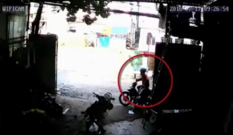 Hình ảnh từ camera ghi lại cho thấy, một nam thanh niên mặc áo đỏ điều khiển xe máy lượn lờ trước cửa nhà, tên này liên tục nhìn về phía cô gái đang cầm điện thoại.