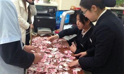 Các nhân viên ngân hàng miệt mài ghép lại số tiền bị nát vụn.