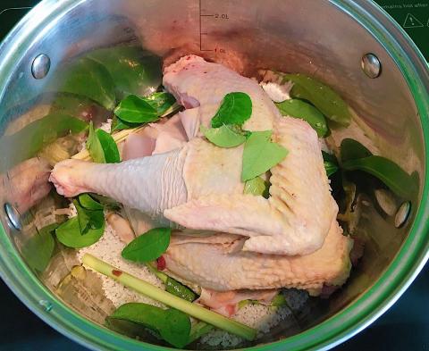 - Rắc một vài lá chanh lên trên mặt gà rồi đậy vung lại hấp với lửa vừa, sau đó để lửa liu riu để gà được chín đều bên trong.