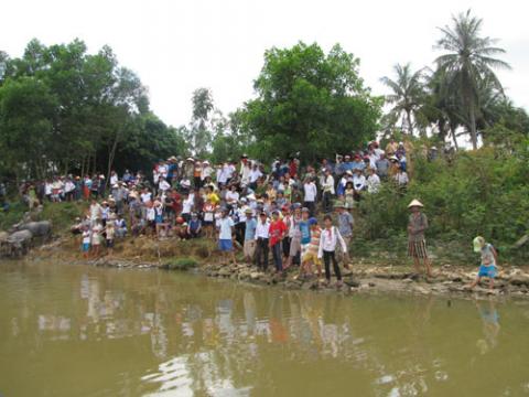 Người dân hiếu kỳ tập trung hai bên bờ sông để theo dõi vụ việc