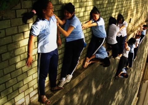 Các bạn trong lớp 11A4 - trường THPT Quốc Học Quy Nhơn - Bình Định đang cứu bạn mình khỏi bàn tay khổng lồ .