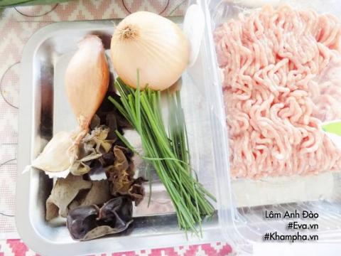 - Phần nhân: 200gr thịt heo xay; 3 nấm mèo thái nhỏ; 1/2 củ hành tây thái nhỏ; 1 củ hành tím thái nhỏ; 2 tép tỏi băm; 1/3 muỗng cà phê tiêu + 1 muỗng cà phê đường + 1 muỗng cà phê nước mắm + 1 muỗng canh dầu hào.