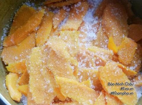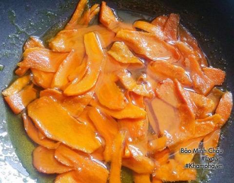 Bước 6: Khi sên mứt, lúc đầu để lửa to, sau khi chảo nghệ sôi thì hạ lửa dần xuống. Thỉnh thoảng dùng đũa đảo nhẹ nhàng.