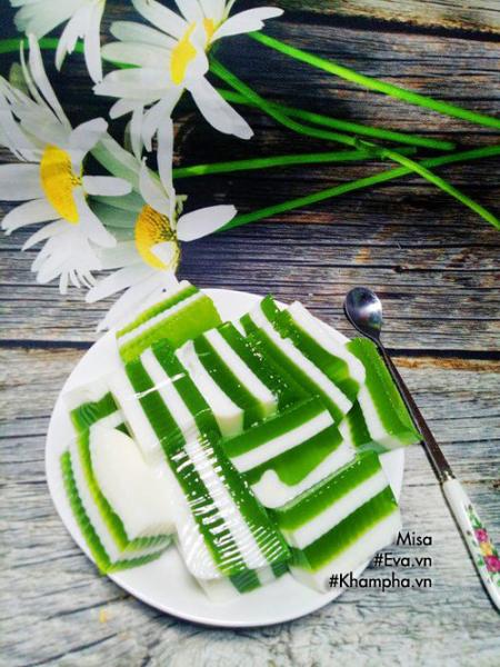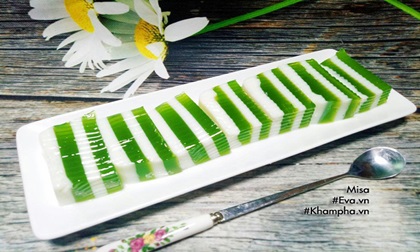 Món thạch mềm giòn, trong veo, có 2 màu xanh trắng bắt mắt, vị ngọt thanh thanh cùng hương thơm lừng của lá dứa quyện với vị béo thơm của sữa tươi thật là tuyệt.
