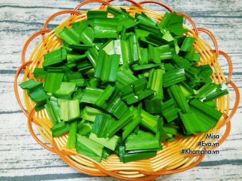 Bước 1: Lá dứa rửa sạch cắt khúc, cho vào máy sinh tố cùng 1 ít nước lọc xay nhuyễn, lọc lấy nước cốt lá dứa khoảng 200ml. Cho thêm 1 muỗng đường cát vào hòa tan với nước cốt lá dứa, để lá dứa ngọt thơm và có màu xanh đẹp.