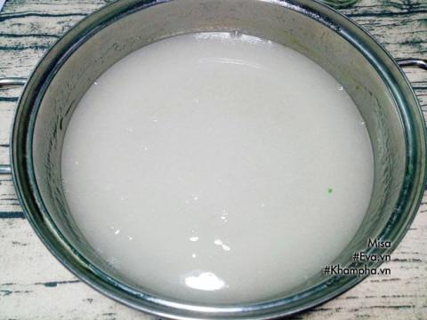 Bước 2: Trộn đều bột agar với đường cát, tiếp đó cho 1600 ml nước lọc vào nồi, ngâm khoảng 10 phút rồi bắt lên bếp nấu. Khi nước thạch sôi lên thì vớt hết bọt cho nước thạch trong.