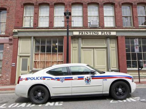 Chiếc xe cảnh sát đỗ bên ngoài tòa nhà nơi phát hiện thi thể của Richard Oland.