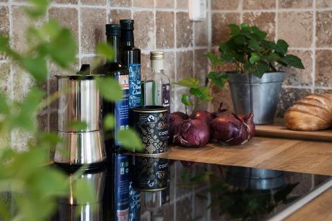 Khu vực nấu nướng được ốp đá tự nhiên giữ vẻ sạch sẽ trong quá trình sử dụng.