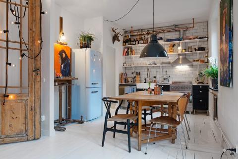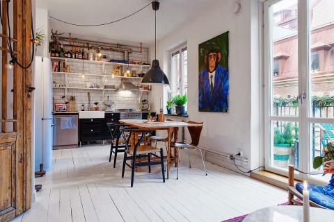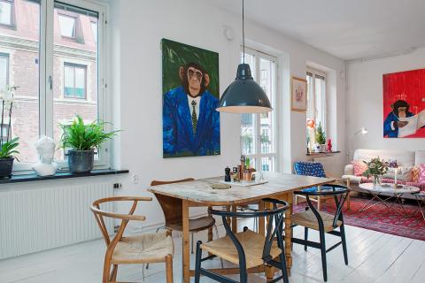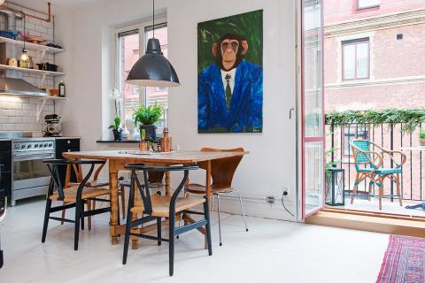 Bức họa chú khỉ tạo sự liên kết giữa các khu vực khác nhau trong không gian sinh hoạt chung khi một lần nữa xuất hiện tại khu vực ăn uống. Bàn ăn được tận dùng làm bằng những miếng gỗ tái chế đóng lại kết hợp với những cặp ghế mộc mạc nhưng vẫn tạo nên sự ăn ý một cách lạ lùng.