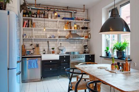 Thay vì sử dụng tủ bếp, chủ nhà lựa chọn sử dụng những dãy kệ mở cho phép lưu trữ tối đa. Không gian không bị che lấp bởi những chiếc tủ đóng kín giúp nó tự nhiên trông rộng rãi, thông thoáng hơn. Thêm vào đó, việc lựa chọn ốp đá cho cả bức tường nhà bếp cũng giúp mang lại cảm giác sạch sẽ trong quá trình sử dụng.