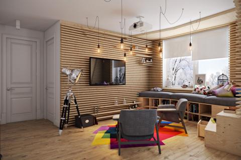 Căn hộ khiến mọi người phải trầm trồ ngay khi đặt bước đầu tiên vào không gian phòng khách. Điều khiến bạn phải để ý trước tiên là những bức tường bắt mắt với thiết kế accordion. Đây chính là một trong những thiết kế độc đáo khiến bạn phải liên tưởng đến phòng trưng bày nghệ thuật. Không chỉ có vậy, những chiếc đèn cũng là một phần hấp dẫn của căn hộ. Nếu như những chiếc đèn treo tạo cảm giác như những tia nắng rót xuống thì những chiếc đèn cây lại gây ấn tượng bởi vẻ đẹp lạ, độc đáo.