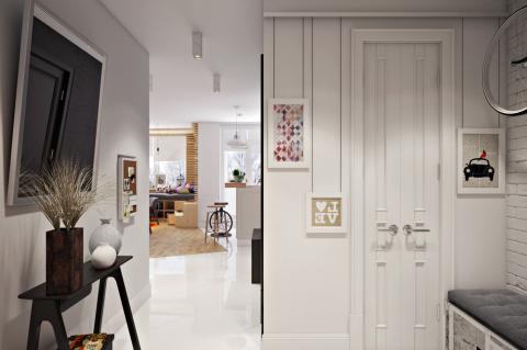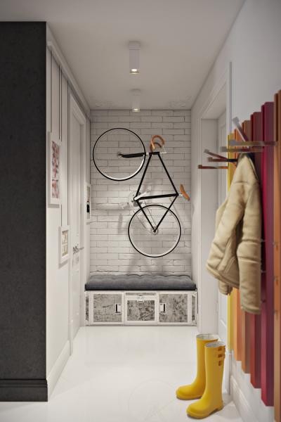 Căn hộ cũng dành ra một lối hành lang nhỏ đầy hữu ích và ấn tượng với những móc quần áo sắc màu, một chiếc xe đạp nhỏ phục vụ cho mục đích vận động hằng ngày.