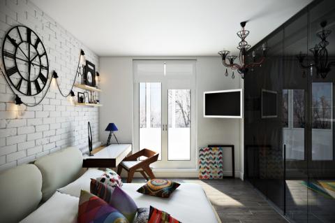 Tông xám nhẹ nhàng được sử dụng trở lại với không gian phòng ngủ tạo cảm giác dễ chịu cho những giây phút nghỉ ngơi. Nét nghệ thuật độc đáo được vận dụng để tạo nên nét hoàn hảo cho căn phòng. Những sắc màu rực rỡ được khéo léo len lỏi vào không gian này qua những chiếc gối nhỏ hay thảm trải sàn.Những bức tranh cỡ lớn lấy đen trắng làm tông màu chủ đạo là cách căn hộ sử dụng để lấp những khoảng trống trên tường.