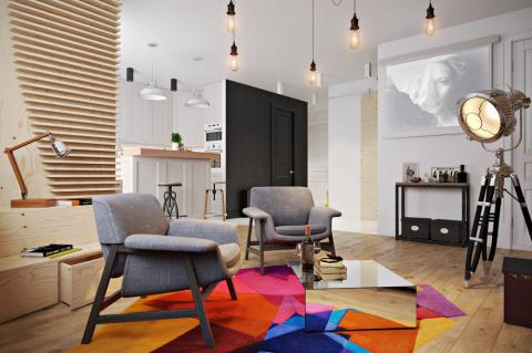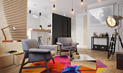 Không gian phòng khách được thổi bừng sáng với chiếc thảm rực rỡ sắc màu.