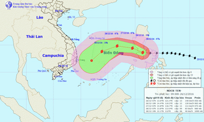 Theo dự báo từ Trung tâm Dự báo Khí tượng Thủy văn Trung ương, khoảng chiều nay (26/12) bão Nock-ten sẽ đi vào vùng biển phía Đông khu vực giữa Biển Đông.
