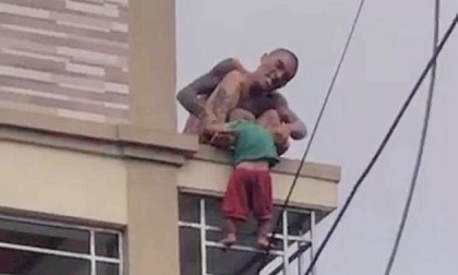 Người cha ngáo đá bế con trai lên sân thượng ở Nghệ An.