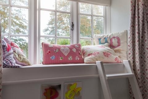 Bước lên tầng trên, bạn sẽ tìm thấy phòng ngủ chính được bài trí đơn giản với giường kê sát cửa sổ lớn, nơi thu trọn khung cảnh sân vườn xanh mát đậm chất đồng quê. Phòng cô con gái nhỏ Poppy ngập tràn màu hồng ngọt ngào, nữ tính trong khi phòng cậu con trai Albie tràn ngập sắc xanh khỏe khoắn với các chi tiết trang trí cảm hứng từ môn thể thao lướt sóng.