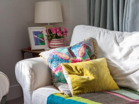 Những chiếc gối tựa sofa bằng vải dệt họa tiết rực rỡ.
